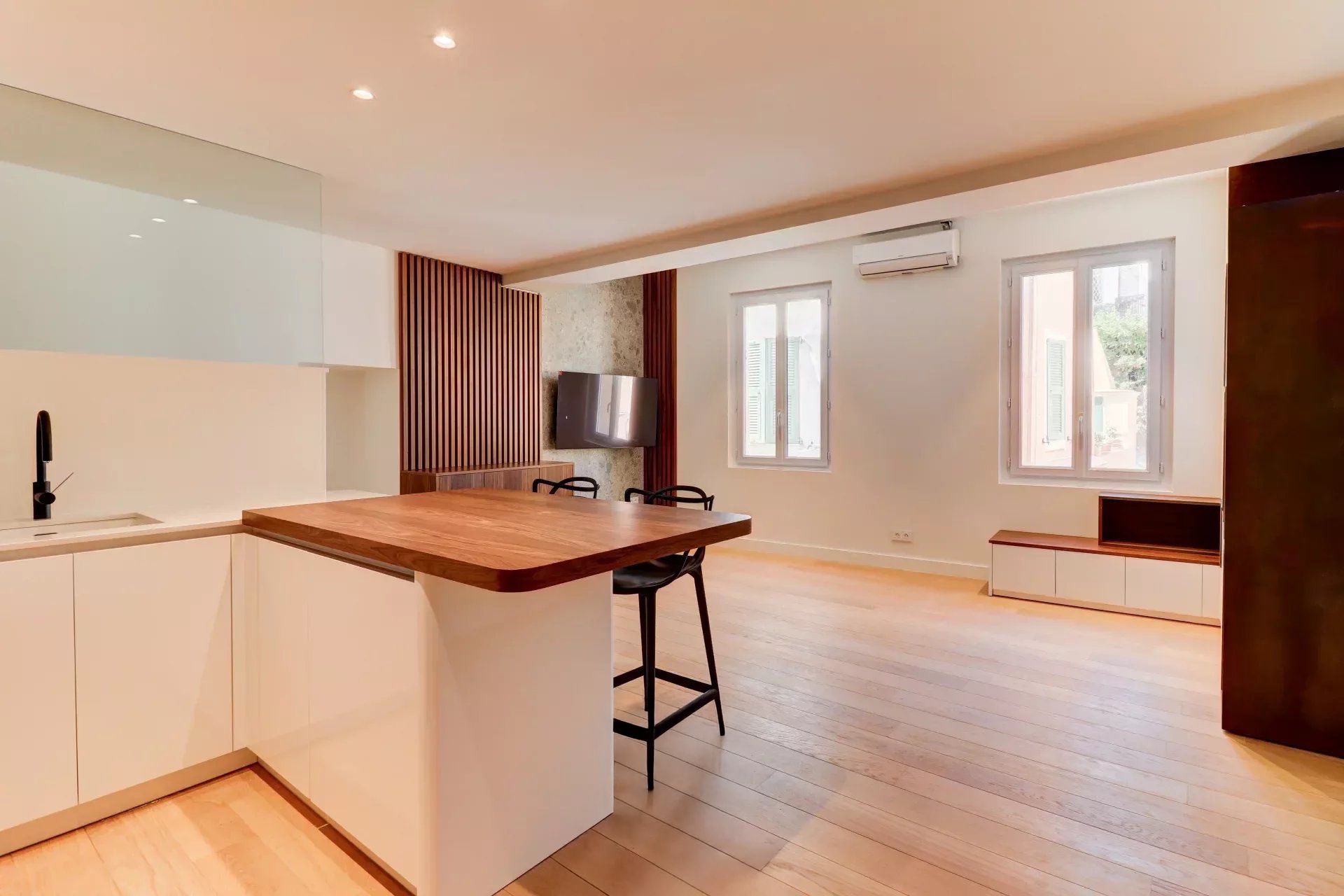 L'appartamento è composto da un ampio soggiorno con cucina attrezzata e attrezzata, una camera da letto con bagno con doccia, WC e cabina armadio su misura. Quest'ultima gode di una magnifica vista sul porto di Villefranche e Saint-Jean-Cap-Ferrat.